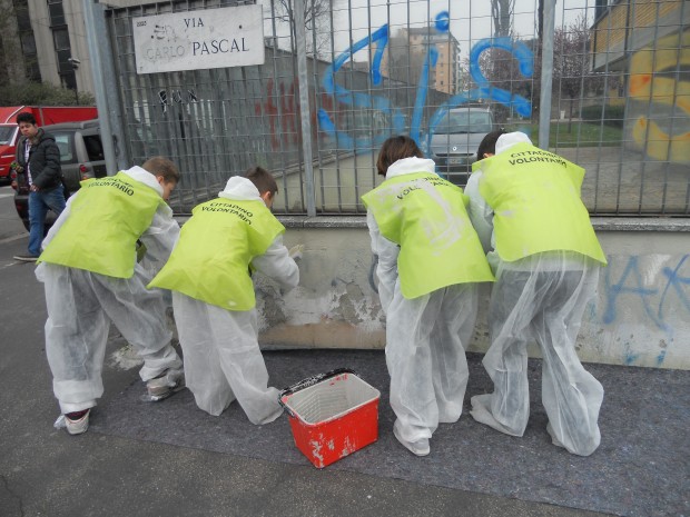 Il terzo evento ha visto protagonisti gli studenti della scuola Cairoli, sempre coordinati dall’Associazione Antigraffiti, impegnati in un intervento di clean-up.